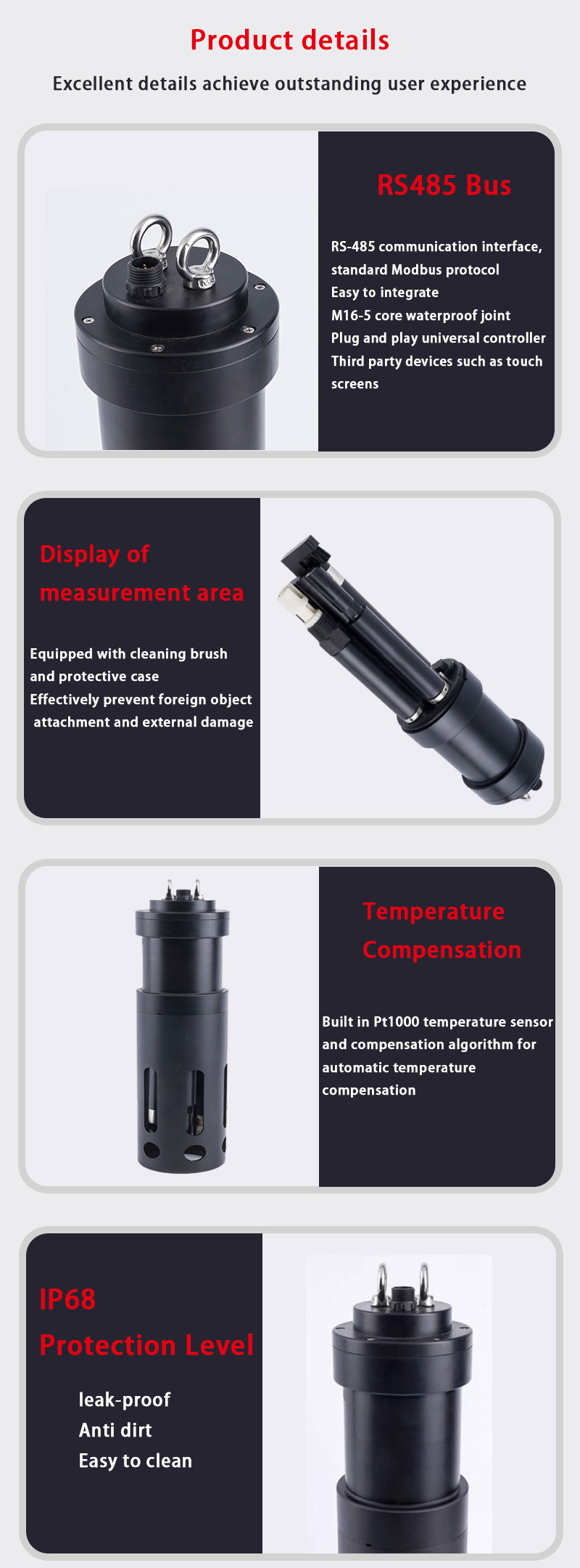 Doté d'une conception étanche IP68 de qualité industrielle et de matériaux résistants à la corrosion, il fonctionne en continu dans des environnements aquatiques difficiles (par exemple, les réservoirs d'eaux usées, l'aquaculture côtière) avec des exigences de maintenance minimales.